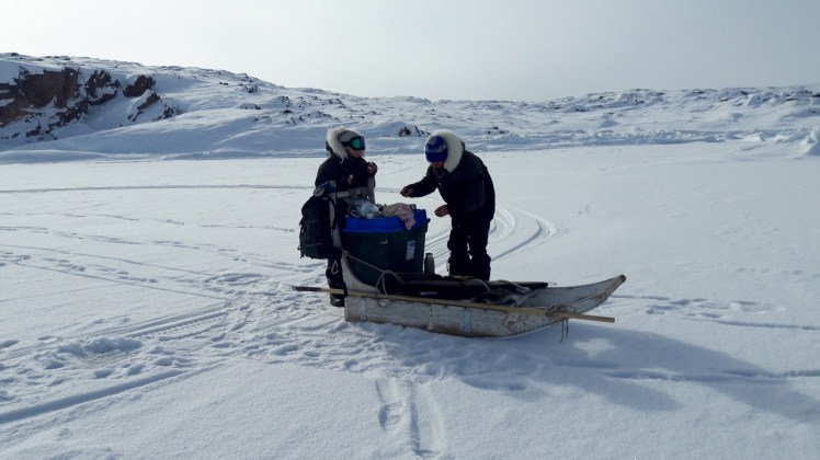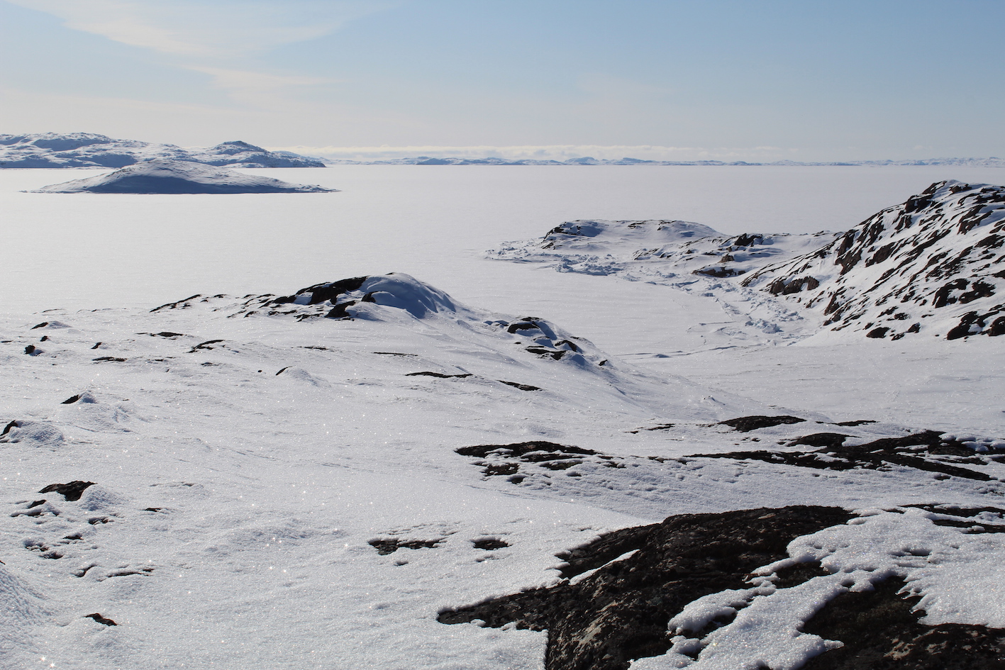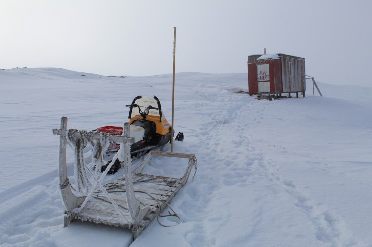 Mais pas trop loin tout de même, quand le skidoo a des ratés on se dit qu’il vaut mieux ne pas être trop perdu. Nous sommes partis à Nivaq avec moto et traineau pour faire ce bivouac depuis longtemps prévu. Et c’est là dans le reste du village, alors que l’on s’apprêtait à traverser une banquise encore inconnue pour nous, vers une petite ile où l’on supposait trouver une cabane, que pafpafpaaaf la motoneige fait des siennes, elle ne veut plus partir. Il faut dire qu’on est bien là où l’on est. On envisage les possibilités. À l’ouest la cabane imaginée ne devrait pas avoir bougée. Mais si l’on revient sur nos pas puis bifurquons un peu plus à l’est, nous savons où trouver un abri avec chauffage et lits. Il est 17h passé. On trafique encore, pas longtemps, change la bougie et c’est parti. Facile finalement, c’est simple l’aventure. Sur la banquise nous allons à l’est en suivant les traces qui longent de près la côte, comme si on avait maintenant peur de s’éloigner. Signes de la fin proche de la terre blanche et glacée ? La cabane est presque à l’ombre, elle fait face à une longue et grande crête, Aluu nous dit la porte. On rentre. Il y a du gasoil dans la petite cuve et le poêle s’allume. Il y a trois lits, une table, des chaussures, des bougies, du lait et des bricoles qui trainent comme on s’attend à trouver, boites, pots, papiers, t-shirt suspendu à un clou. La nuit est claire et fraiche. On se couche avant le jour et une clarté bleue nous accompagne dans le sommeil. Il fait chaud. Au matin, le soleil est debout bien avant nous, il illumine une brume brillante qui diffuse sa lumière sans ombres. Les vitres sont gelées, nous rallumons le poêle et buvons un café. On hésite. Sommets ou vallées, nous ne voyons que les cailloux noirs devant nous. Alors nous décidons de rentrer par un chemin connu. Je finis le voyage à pied à travers la banquise, la brume s’est éloignée. J’en profite car par endroit on nous dit de plus aller. Nous repartirons dit-on, cette cabane nous fait envie, et nous irons peut-être à ski.