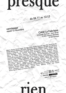 Vous êtes cordialement invités à l’exposition « Presque rien » à la Fabrique, CIAM Université Jean-Jaurès de Toulouse. Vous êtes conviés à découvrir ma dernière oeuvre produite pour cette exposition.