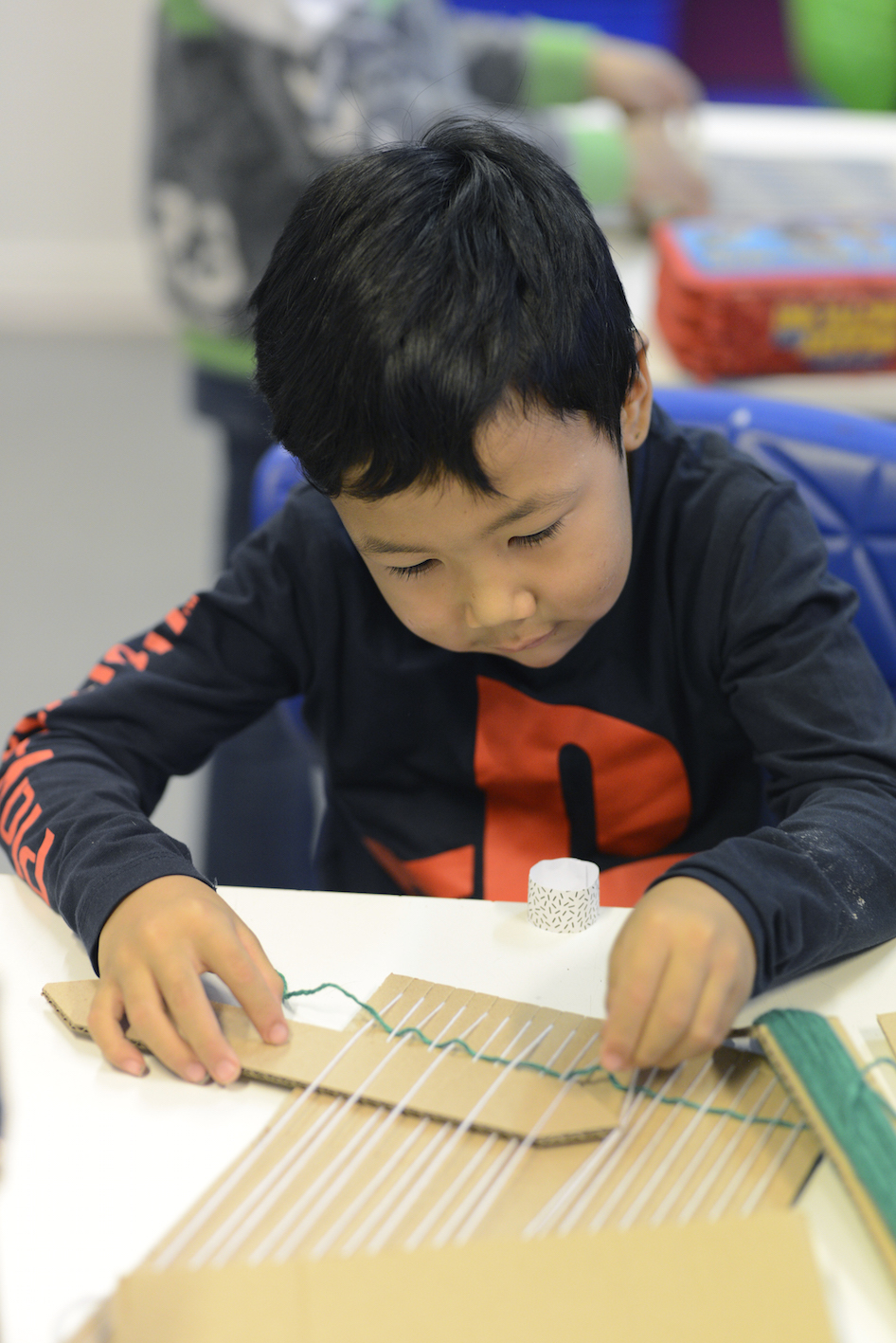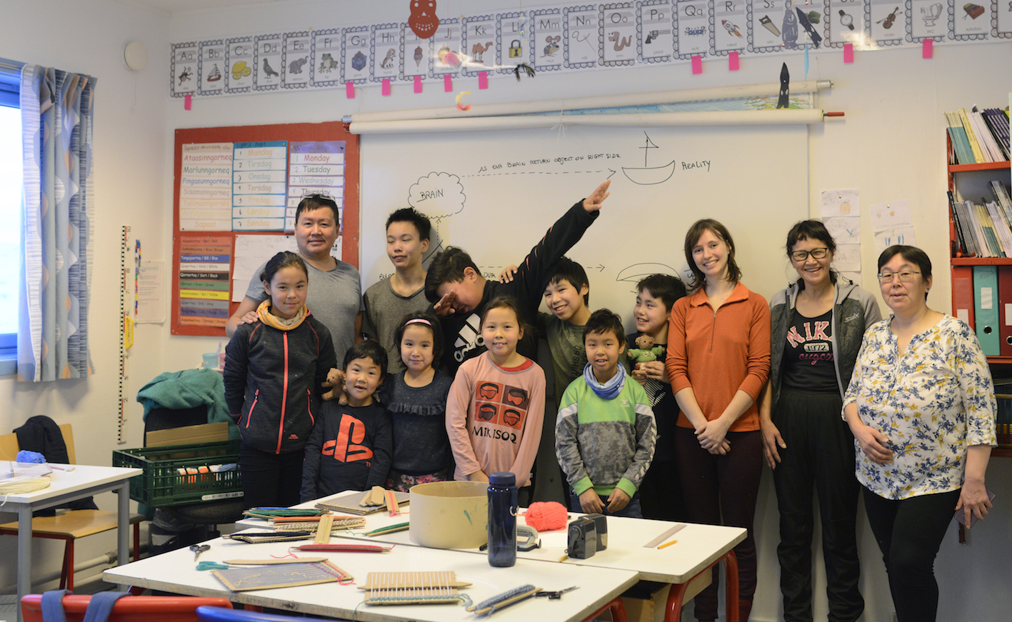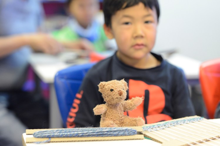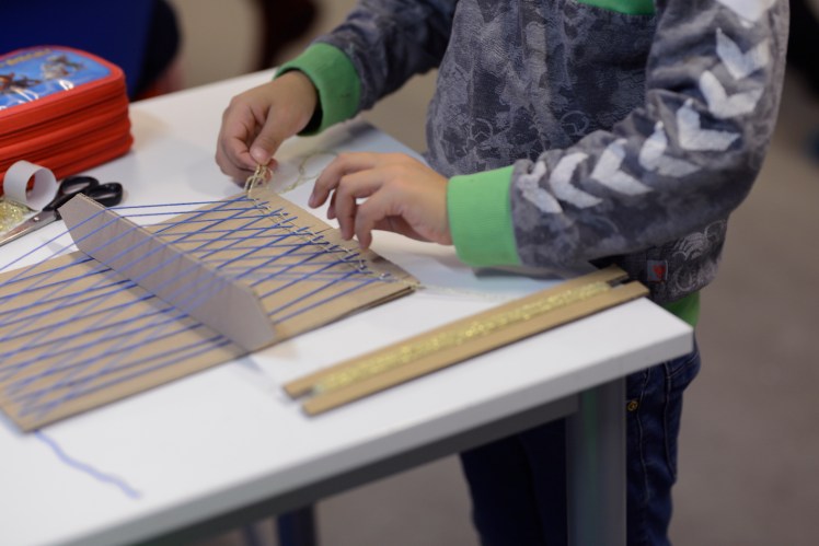 Après les tumultueuses aventures du Manguier de ces derniers jours, sur lesquelles je reviendrai plus tard, les ateliers ont démarré aujourd’hui à l’école avec Marion qui proposait un atelier de tissage. Costanza était derrière l’objectif pour immortaliser la scène,