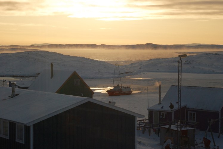 Et depuis, ça bosse, pour accueillir les nouveaux artistes qui devraient être à Aasiaat mardi, et peut être dans la foulée à Akunnaaq. Peut être, car curieusement le froid s’est installé en cette fin de mois de février (-20°C), et du coup la mer « prend » à vue d’oeil. Et elle fume, fume, comme l’haleine d’un cétacé géant … ce qui laisse pas mal d’incertitudes sur le trajet Aasiaat/Akunnaaq …