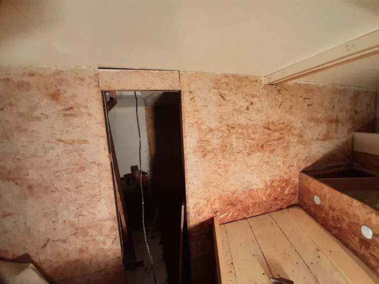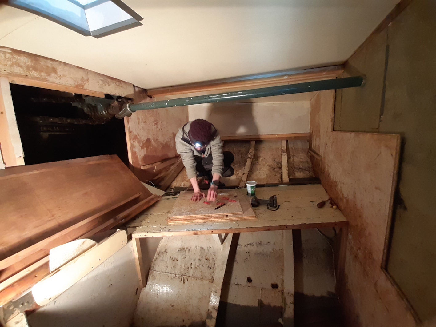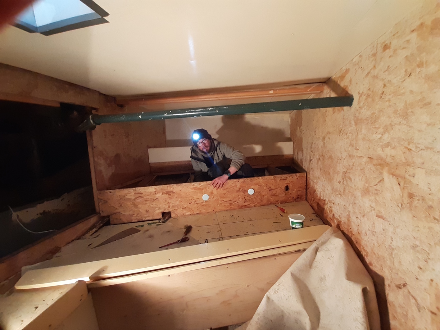 La cabine vidée, nous nous sommes attaqués avec Luc au démontage total des aménagements, car dans notre souci de soigner l’acoustique, nous avions incorporé avec André en 2004 au Frioul de la laine de roche dans les cloisons doubles, qui bien évidemment gorgée d’eau de mer n’aurait jamais séchée. Ce travail va nous prendre encore quelques longues journées, mises à profit pour découvrir les nombreuses qualités de mon « second », sans qui j’aurais bien du mal à venir à bout de ce chantier. Un grand merci à toi Luc !