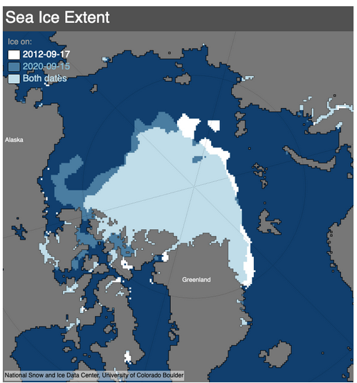 Le 15 septembre 2020, la banquise du Pôle Nord a atteint son nouveau minimum: 3,74 millions de kilomètres carrés. En clair, une peau de chagrin …