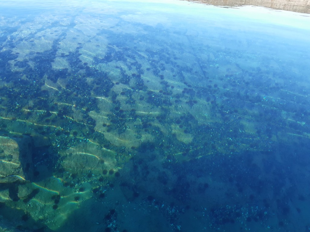 J’ai regardé le fond de la mer, les milliers d’oursins, nos amies les méduses, les algues … J’ai imaginé le Manguier échoué sur les rochers du centre de la baie, comme une demeure immobile …