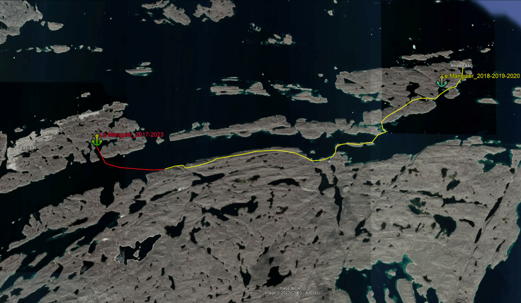 Depuis le village d’Akunnaaq, l’ami Gert viendrait déposer Gwen en ski-doo sur l’île de Saqqardlip (Ana, l’épouse de Gert indique le point de dépose sur la carte ci-dessous).