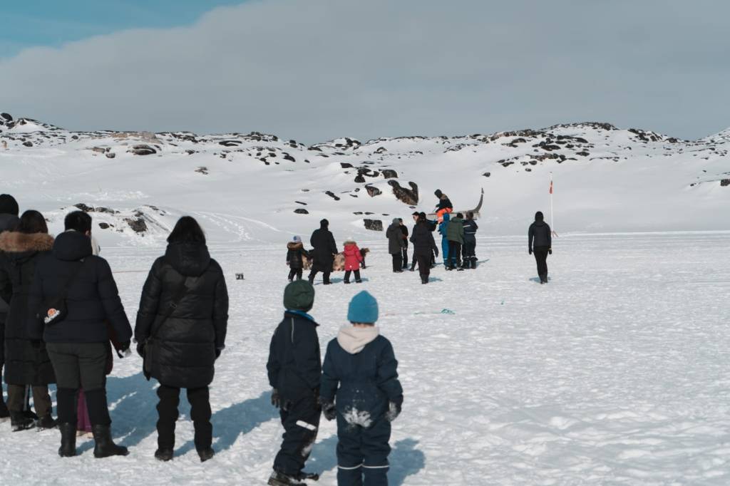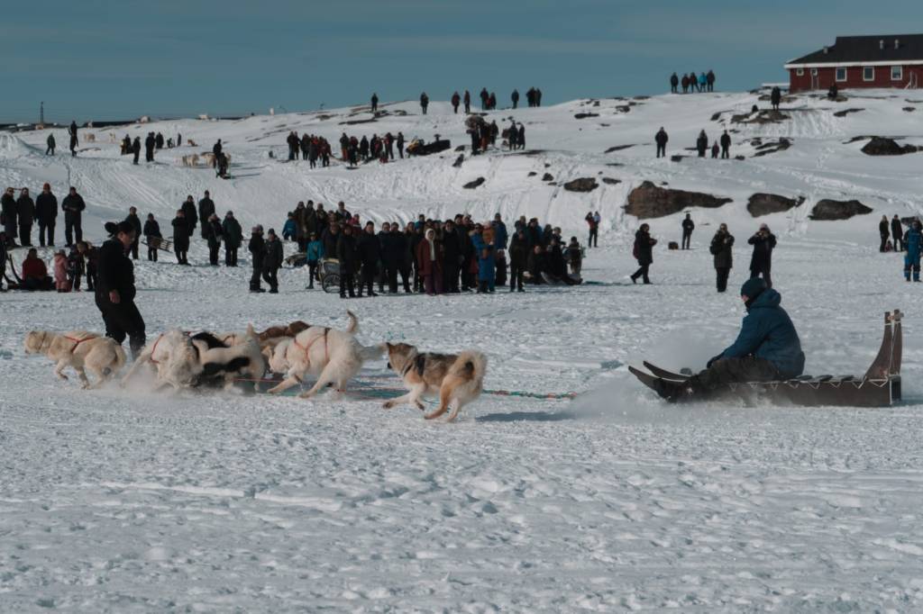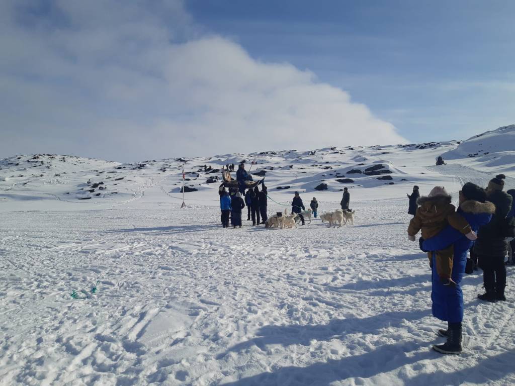 Le vainqueur de la course se voit soulevé, toujours assis sur le traineau, par les spectateurs, à deux mètres du sol.