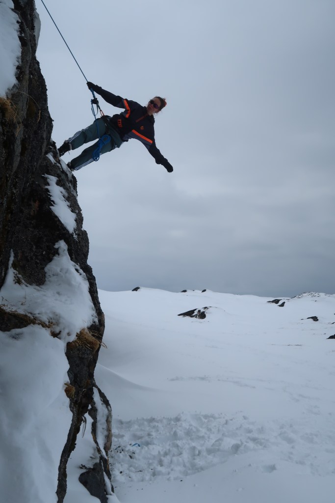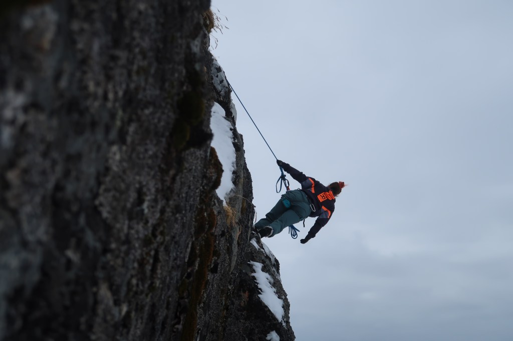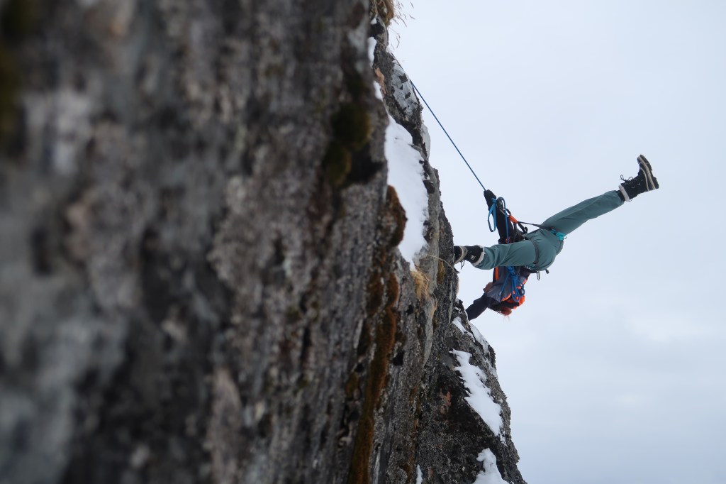 Malgré les conditions météo quasi-hivernales, Emily n’hésite pas à s’accrocher à sa paroi pour tester ses premiers pas de danse acrobatique !