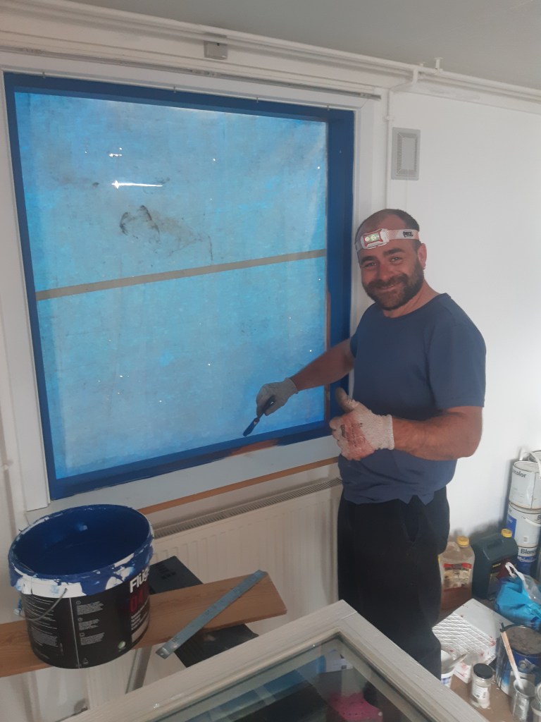 Enfin, avec Félicien, nous nous sommes mis au travail, et en attendant de pouvoir grimper sur le toit (il fait vraiment pas très beau), nous nous occupons de démonter, graisser et repeindre toutes les fenêtres …