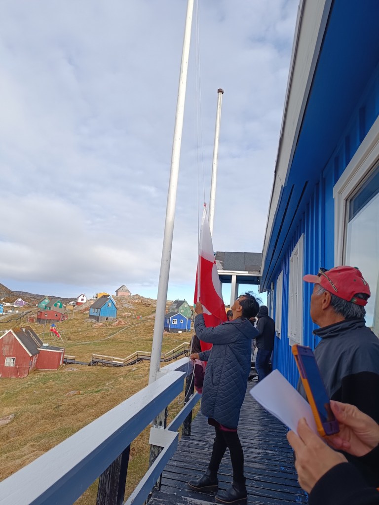 La journée commence par un réveil matinal à 7h10, prolongé jusqu’à 7h40 au lit … puis à peine réveillé, nous (Félicien et moi) partons à pied pour le Sullivik. Là une grande partie du village (mais la plupart des chasseurs sont absents, encore au lit ?) est réunie pour la levée des couleurs et entonner l’hymne du Groenland. Chant à l’image de l’espace temps du Groenland, un chant lent et long, qui n’a rien à voir avec la rapidité du monde moderne.