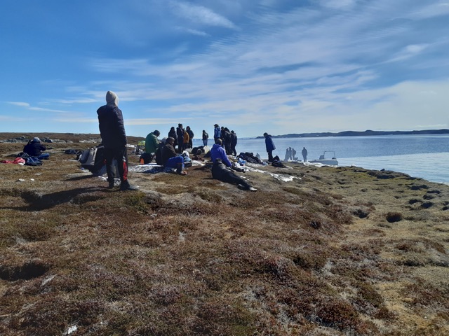 Retour à la case avant le départ des chasseurs pour la chasse au phoque. Le départ est donné à 10h, Félicien embarque avec un jeune chasseur (Jacob), Anne et Aude embarquent avec un jeune couple. Je suis absorbé à bord du Manguier pour changer le boulon cassé du presse étoupe, et donc je ne rentre que vers 11h30, heure à laquelle les chasseurs reviennent avec leur prise. Bien évidemment, c’est Lars qui a réussi à tirer le premier phoque, un phoque groenlandais. Les filles reviennent aussi avec un phoque, et c’est avec les phoques en bandoulière que nous partons vers l’île d’en face (Merquarigsoq) pour le picnic. J’apprendrai que les chasseurs sont partis en trombe en direction de Nivaq, et que c’est là qu’ils ont attrapés les phoques.