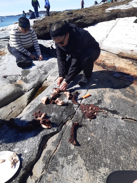 Tout le village est sur l’île, et même beaucoup de gens qui n’habitent pas à Akunnaaq. Lars le premier dépèce son phoque, sous l’oeil attentif de tous, et chacun s’occupe de préparer sa soupe de phoque (suasat) sur des petits feux de toundra et de bois flottés. En plein dépeçage du phoque, le téléphone de Lars sonne, c’est Mari qui répond: choc des cultures, le portable et le dépeçage du phoque !
