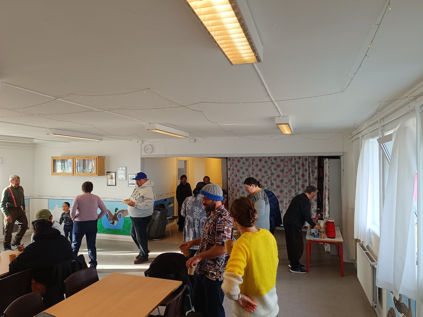 Après le repas, nous avons un petit speech de Gert adresssé à Jens Pi pour sa contribution au maintien de la culture groenlandaise, suite à sa tournée dans la commune d’Aasiaat où il a animé des soirées sur les qivitoq et autres sorcières et fantômes.
