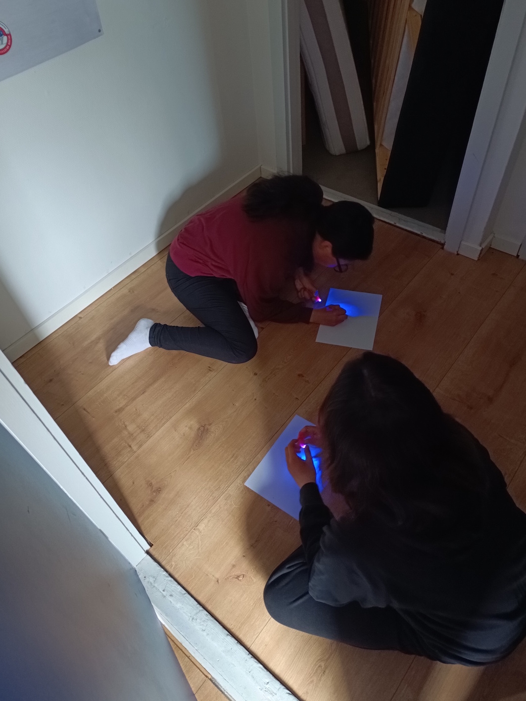Anne a proposé un atelier de gomme a graver et moi du dessin a l’encre phosphorescente.