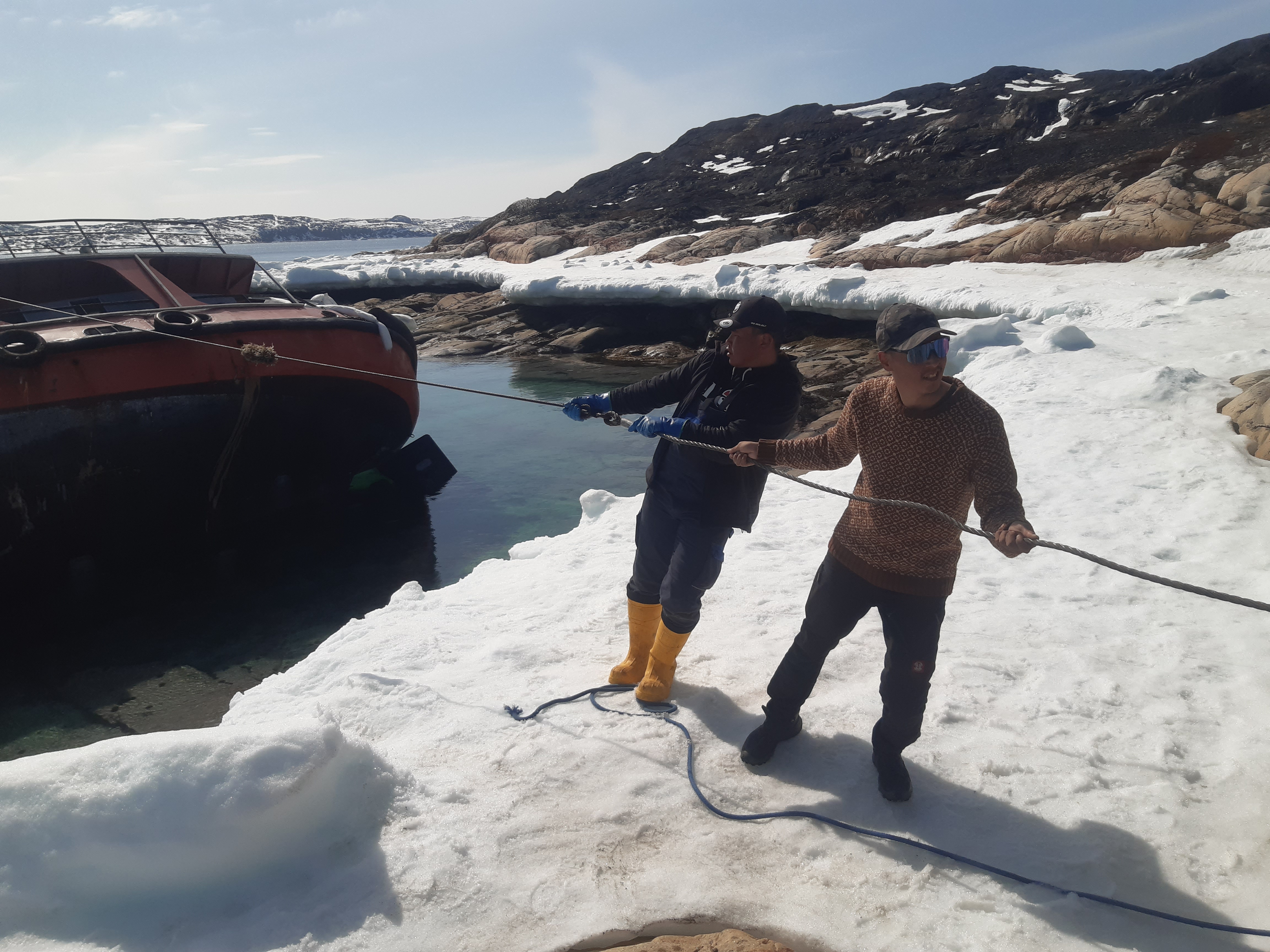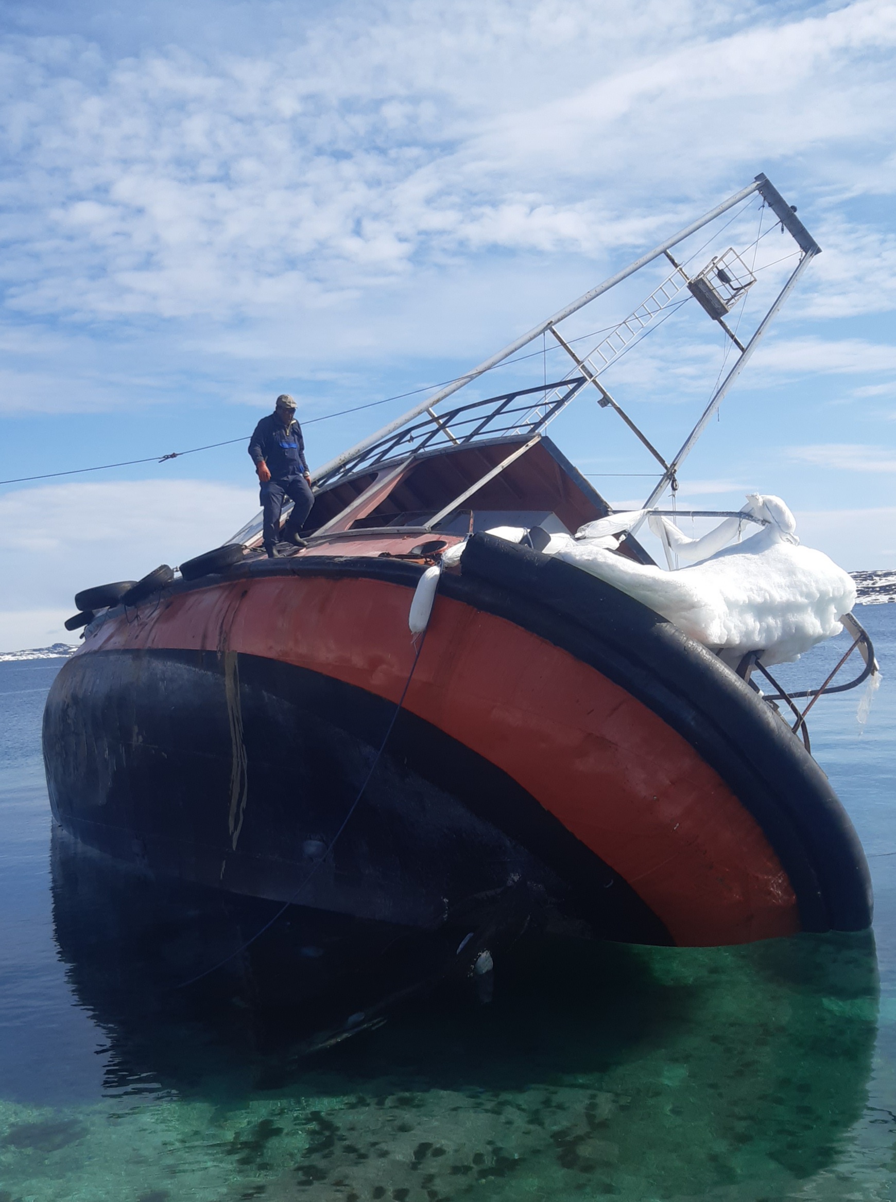 Le fidèle Tohatsu, acheté en 2010 à Seward en Alaska, démarre au 3 coups de lanceur, as usual. Quelle mécanique ! Pourtant il a déjà fait un séjour d’une bonne demi-heure par 30 mètres de fond, lors d’une précédente galère … Mais il est toujours là pour m’aider à filer vers Aasiaat pour récupérer le matériel dont nous aurons besoin. Une heure après je suis sur place, l’équipe de KJ, la grosse boîte de travaux publics, m’attend, on charge, je repars …