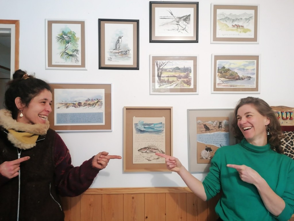 Avec Gwen dans l’atelier de Vanessa, Artiste en Arctique 2025, devant quelques unes de ses aquarelles.