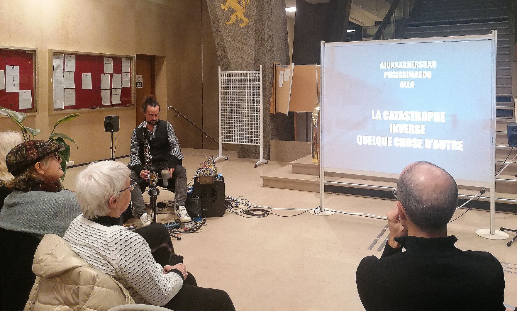 Très beau moment ce vendredi 9 janvier à la Mairie du 8e arrondissement de Lyon avec la performance musicale/vidéo/poétique de Julien Lachal pour l’ouverture de son exposition « FORESHADOWS – Kaperlak », consacrée au travail réalisé pendant sa résidence d’hiver « Artiste en Arctique » 2024.