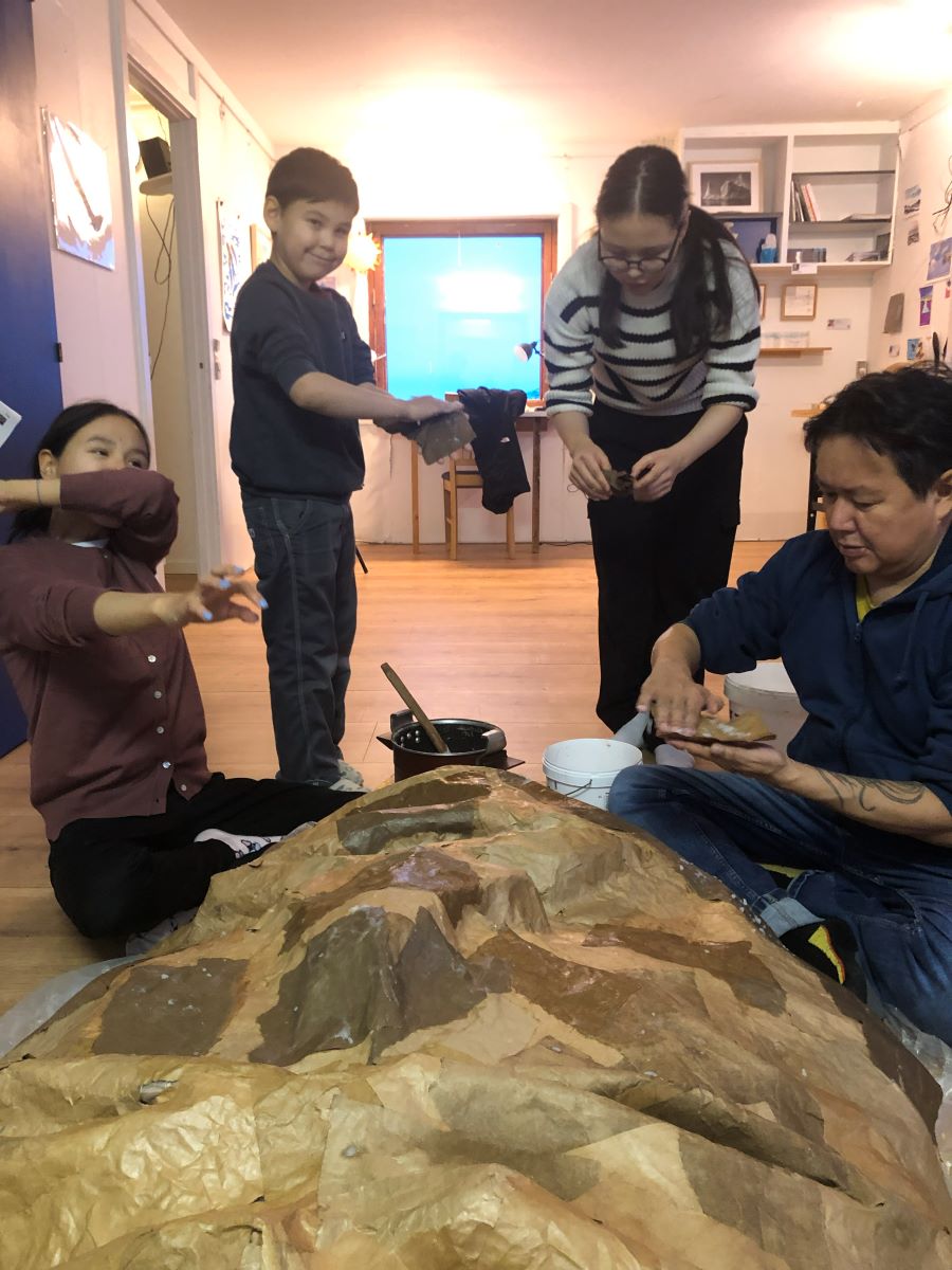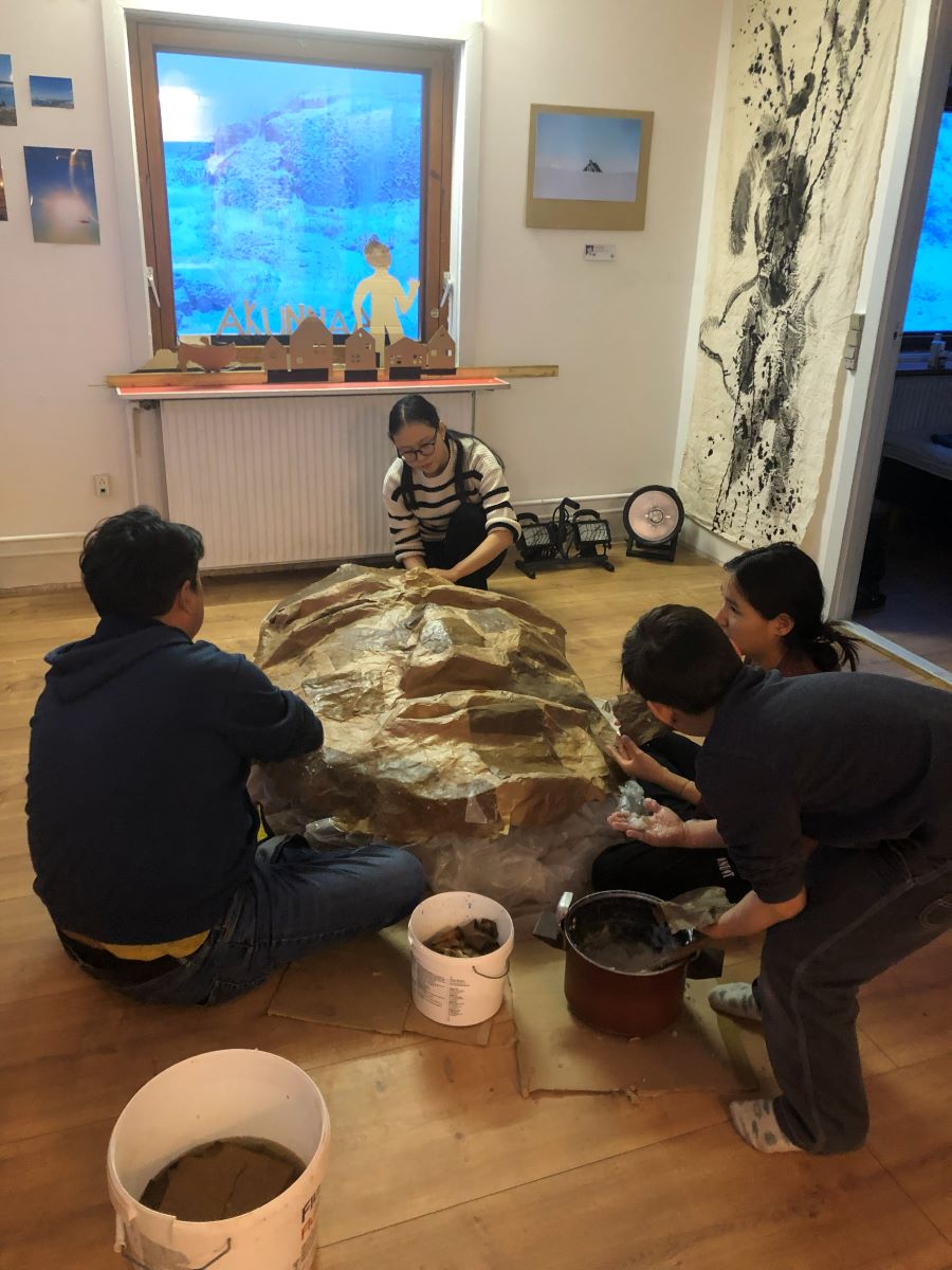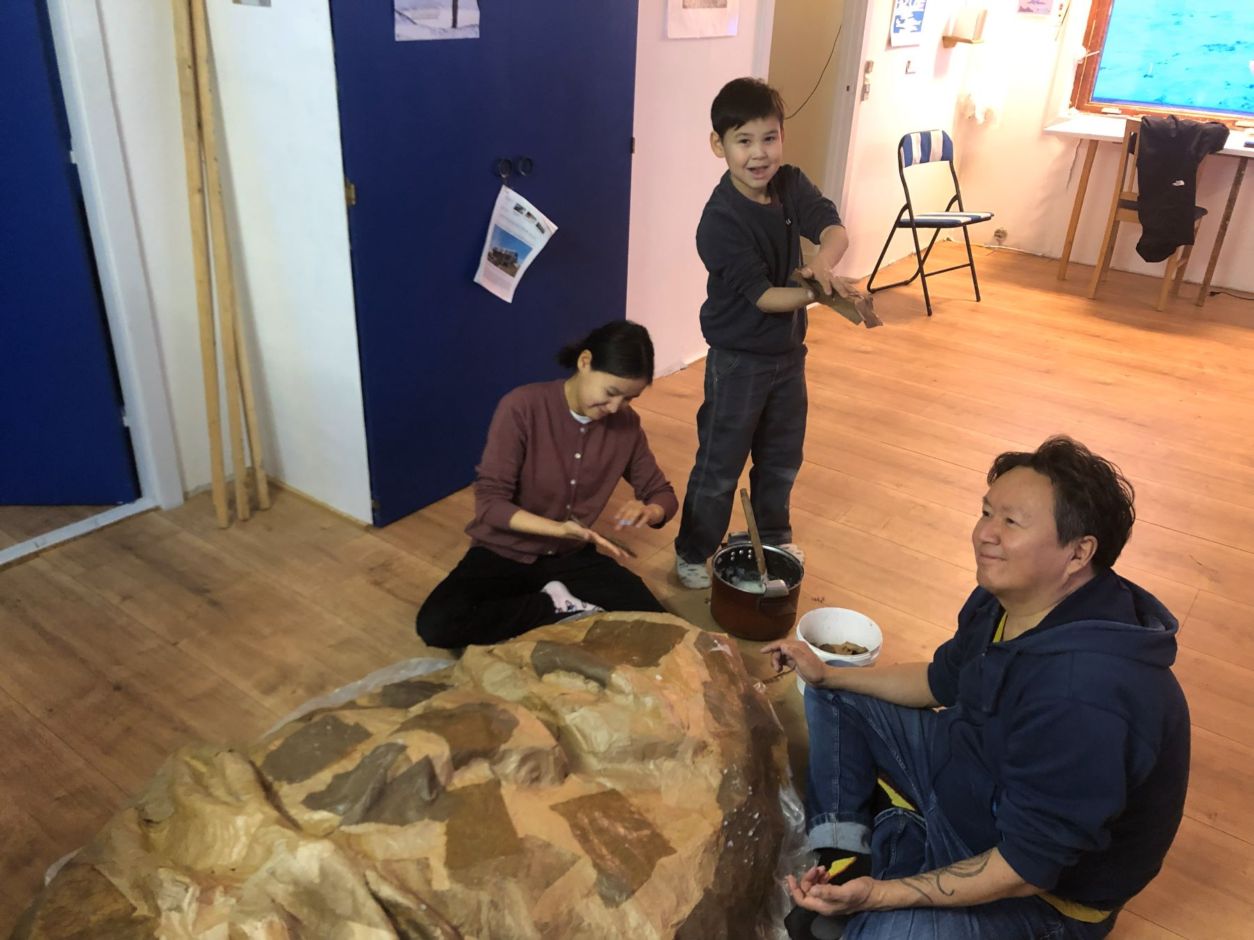L’objectif est de rassembler les histoires de géants du Groenland, « Tunersuit », et construire ici un géant de papier mâché.