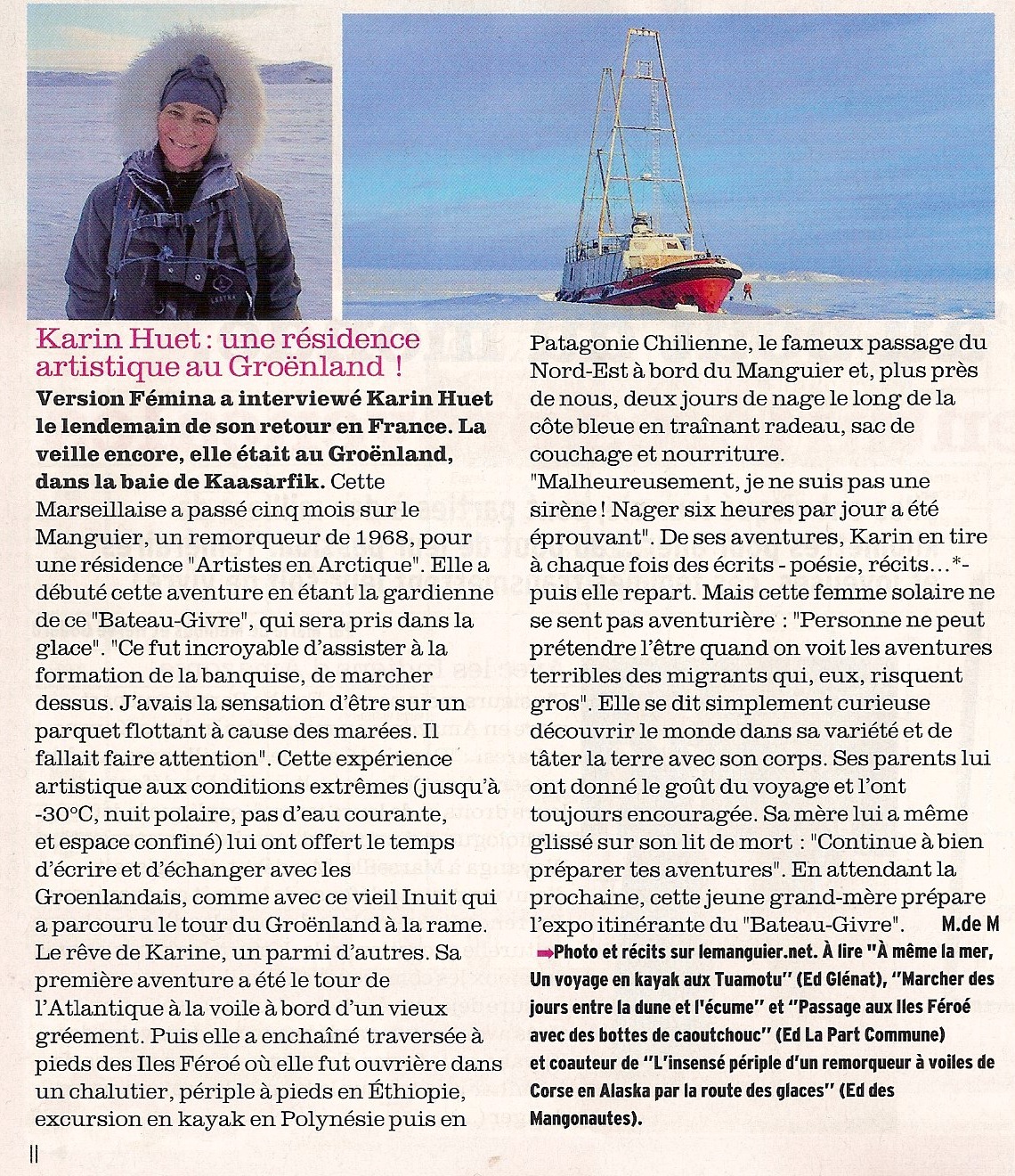- 25/03/2017 – Karin Huet : Une résidence artistique au Groenland (Fémina)