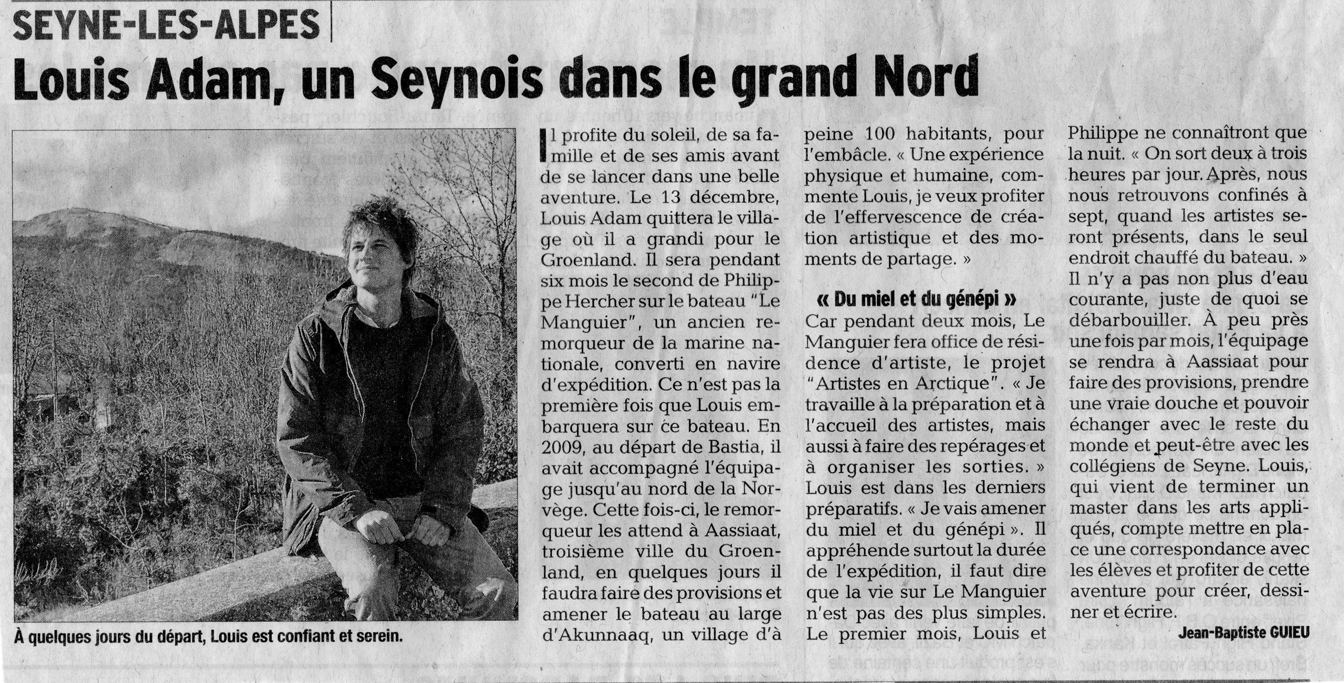 - 01/12/2017 – Louis Adam, un Seynois dans le Grand Nord (Le Dauphiné Libéré)