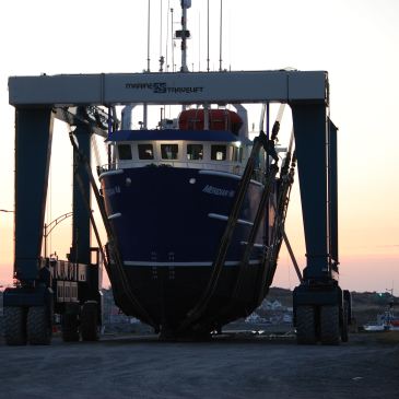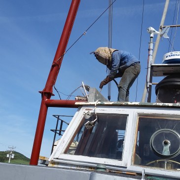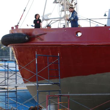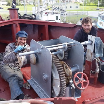 Encore une ! Une couche de peinture dans les fonds du coqueron arrière, la troisième … Ouf, on va pouvoir passer à la reconstruction ! Ça se fête ! Ce soir, on est au Brise Bise à Gaspé, pour manger la fameuse « poutine aux crevettes » !!!