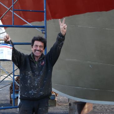 L’arrivée vendredi de Catherine, Danielle et Vincent a permis un saut significatif dans l’avancement des peintures ! Sur toute la coque (oeuvres vives et mortes), nous avons fini de passer les 2 couches de primer alu, suivi pour les oeuvres vives d’une première couche de primer couleur bronze du plus bel effet ! Goldfinger ! … Lire la suite De sang et d’or par Phil le marin