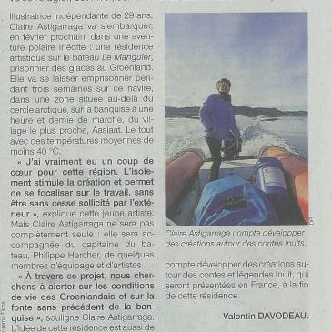 Le quotidien régional Sud-Ouest vient de publier un article sur Claire Astigarraga, qui participera en février prochain à la première des trois résidences d’artistes organisées par l’association « Le Bateau-Givre » à bord du Manguier dans les glaces du Groenland.