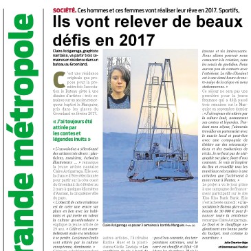 Dans l’édition du 2 janvier 2017 du quotidien régional Presse Océan, Claire Astigarraga, qui rejoindra le Manguier en février prochain, présente le projet Artistes en Arctique et le programme qu’elle s’est fixé en tant qu’artiste en résidence.