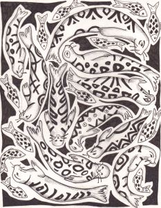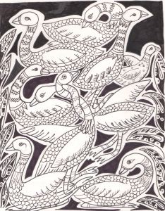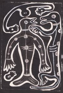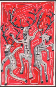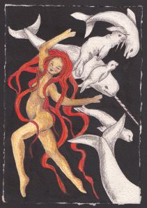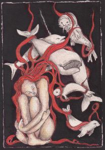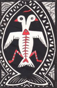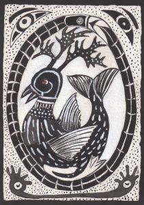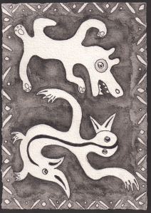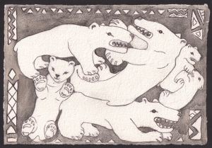 Dessins de Cécile Zawieja réalisés de septembre 2013 à juillet 2014 durant un hivernage dans les glaces de l’Arctique Canadien à bord du Manguier. Ces dessins sont inspirés d’une part de la culture inuite à travers les légendes locales et certains motifs traditionnels, d’autre part par l’immersion dans l’univers boréal lié au cycle des saisons.