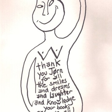 Envoyés par porteur spécial, je vous laisse découvrir ci-après les petits mots/dessins envoyés à Jørn Riel, « par qui tout a commencé » !!!